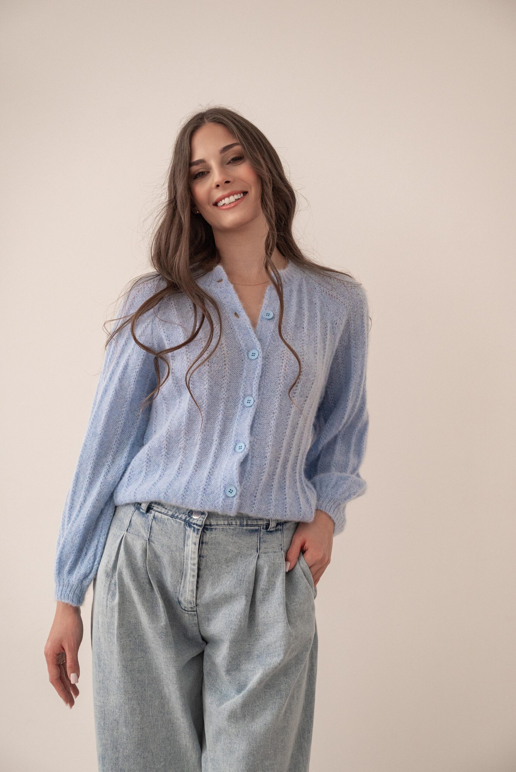 Kardigan BOSCO to połączenie subtelnej kobiecości i luksusowego komfortu. Zapinany na guziki, w odcieniu jasnego błękitu, który otula stylizację miękkością i lekkością. Wykonany z wyjątkowej przędzy baby alpaka — niezwykle delikatnej, ciepłej i przyjemnej w dotyku — zapewnia komfort noszenia przez cały dzień. To ponadczasowy element garderoby, który doskonale sprawdzi się zarówno w codziennych stylizacjach, jak i w bardziej eleganckich zestawach.