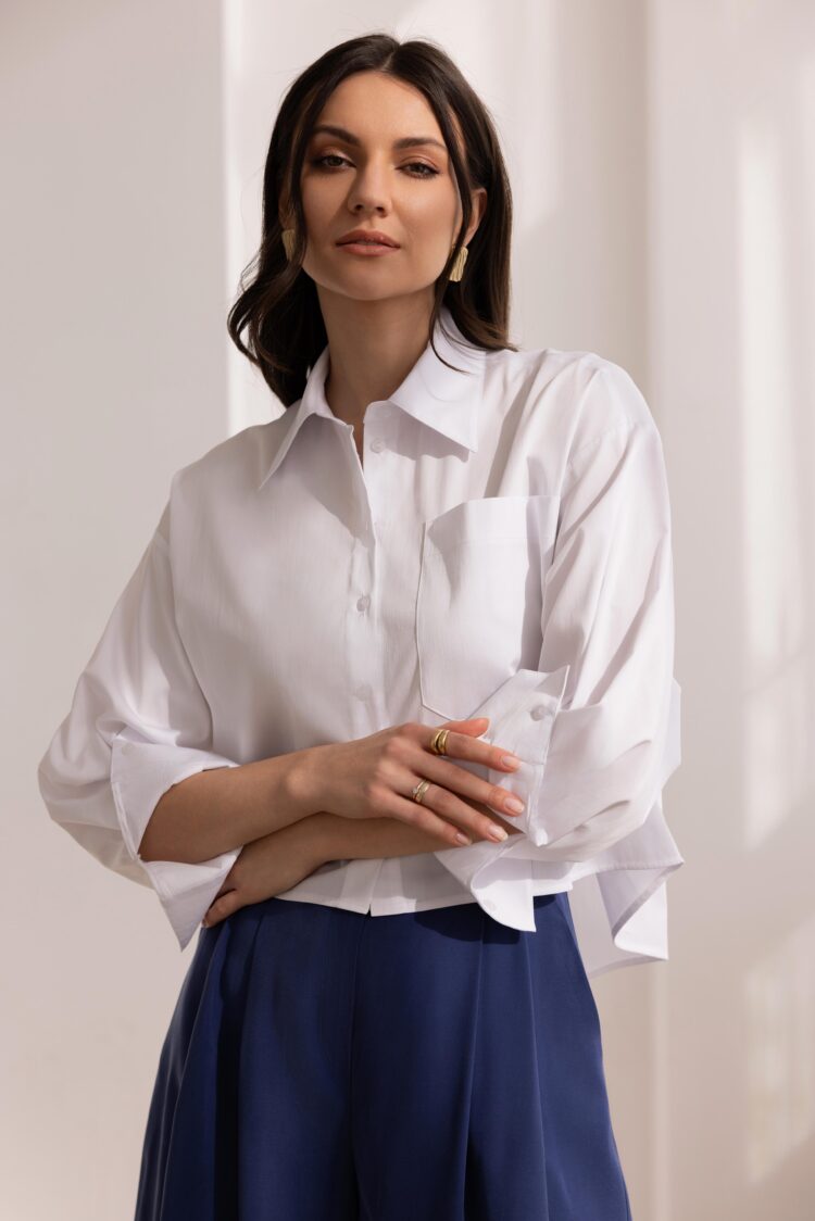 Koszula posiada krótsze podpięte rękawy, co dodaje jej subtelnie casualowego charakteru. Klasyczna biel sprawia, że jest to uniwersalny element garderoby — doskonały zarówno do codziennych stylizacji, jak i bardziej eleganckich zestawów.