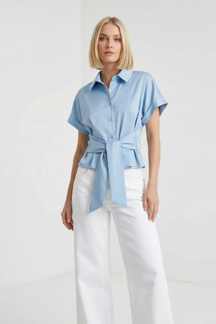 Elegancka i kobieca koszula, która zachwyca prostotą i dopracowanymi detalami. Model wyróżnia się szeroką szarfą wiązaną w talii – dzięki niej koszula zyskuje wyjątkowy charakter i pięknie podkreśla sylwetkę. Klasyczny kołnierzyk i gładka tkanina sprawiają, że to uniwersalna propozycja zarówno do pracy, jak i na specjalne okazje. Świetnie komponuje się z cygaretkami, spódnicą lub jeansami, tworząc stylowy i nowoczesny look.