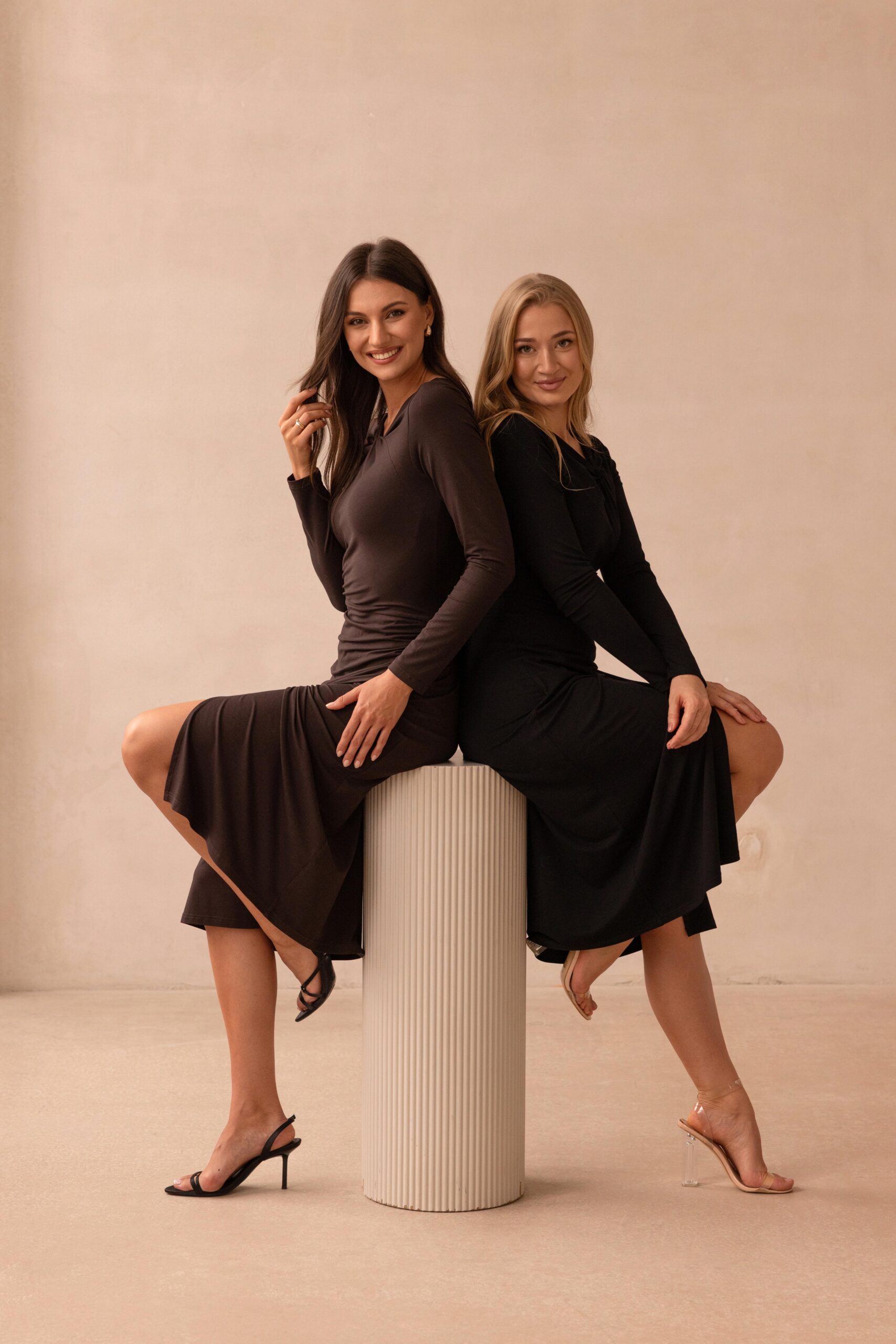 Sukienka dzianinowa w kolorze głębokiej czekolady to połączenie elegancji i zmysłowego komfortu. Wykonana z miękkiej, elastycznej dzianiny pięknie dopasowuje się do sylwetki, a subtelne drapowania podkreślają jej kobiecy charakter. Długość midi nadaje kreacji wyrafinowania, zaś fantazyjny dekolt przyciąga wzrok i dodaje całości oryginalnego wyrazu. To idealna propozycja zarówno na wyjątkowe okazje, jak i stylowe codzienne stylizacje.