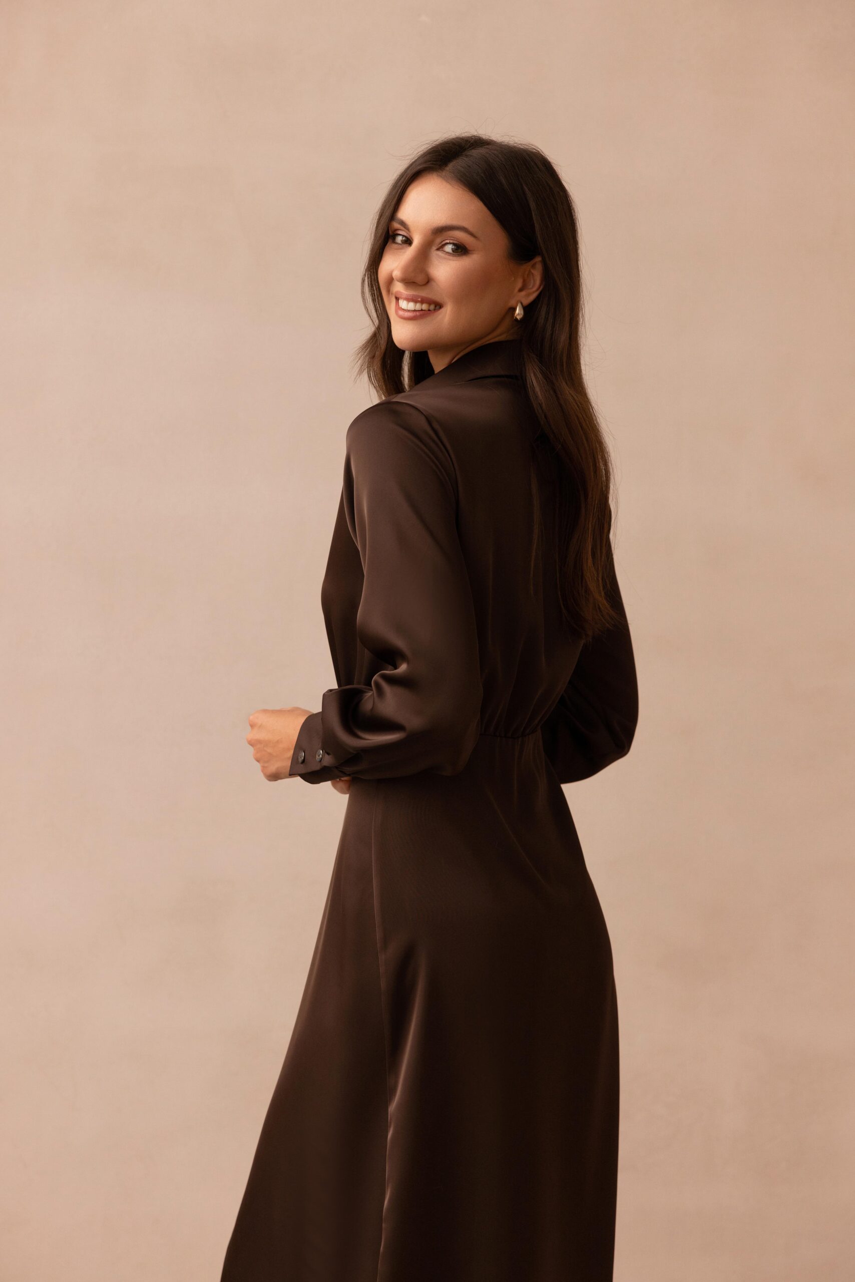 Ta elegancka sukienka midi została uszyta z przyjemnej w dotyku wiskozy z dodatkiem recyklingowanego poliestru, dzięki czemu łączy w sobie lekkość naturalnych włókien i trwałość materiałów z odzysku. Model subtelnie dopasowuje się w talii, podkreślając sylwetkę, a zapięcie na guziki na całej długości dodaje jej klasycznego, kobiecego charakteru. Delikatnie układa się podczas ruchu, sprawdzając się zarówno w codziennych stylizacjach, jak i na bardziej eleganckie okazje. Idealny wybór dla osób ceniących ponadczasowy styl i świadome podejście do mody.