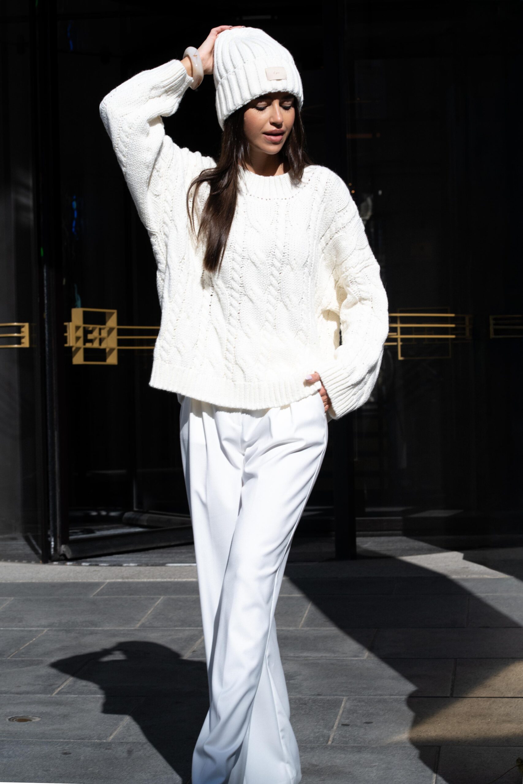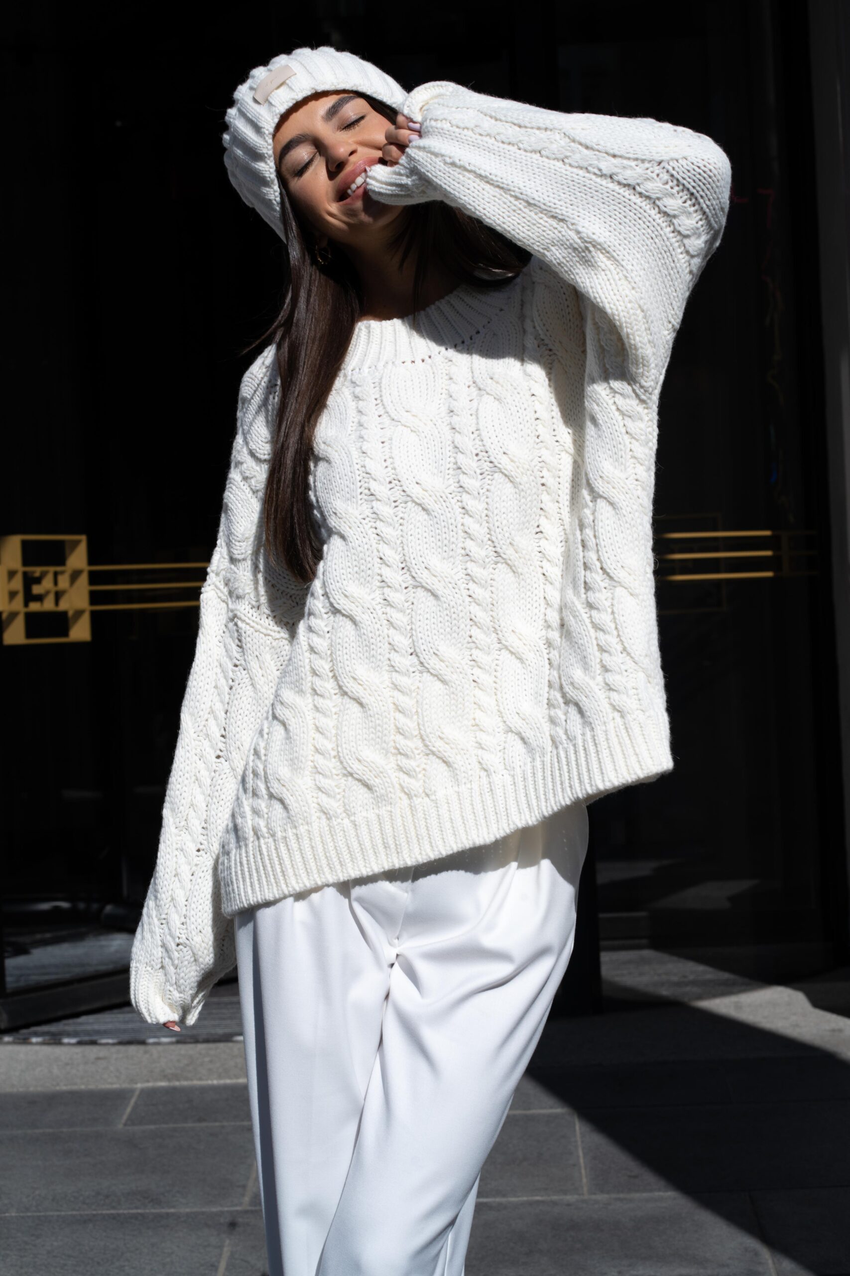 Piękny kolor ecru podkreśla elegancję i ponadczasowy charakter swetra, sprawiając, że łatwo dopasujesz go do wielu stylizacji — od codziennych jeansów po bardziej wyrafinowane zestawy. Wyraziste warkocze dodają mu tekstury i klasycznego uroku, dzięki czemu sweter staje się wyjątkowym elementem garderoby na wiele sezonów.