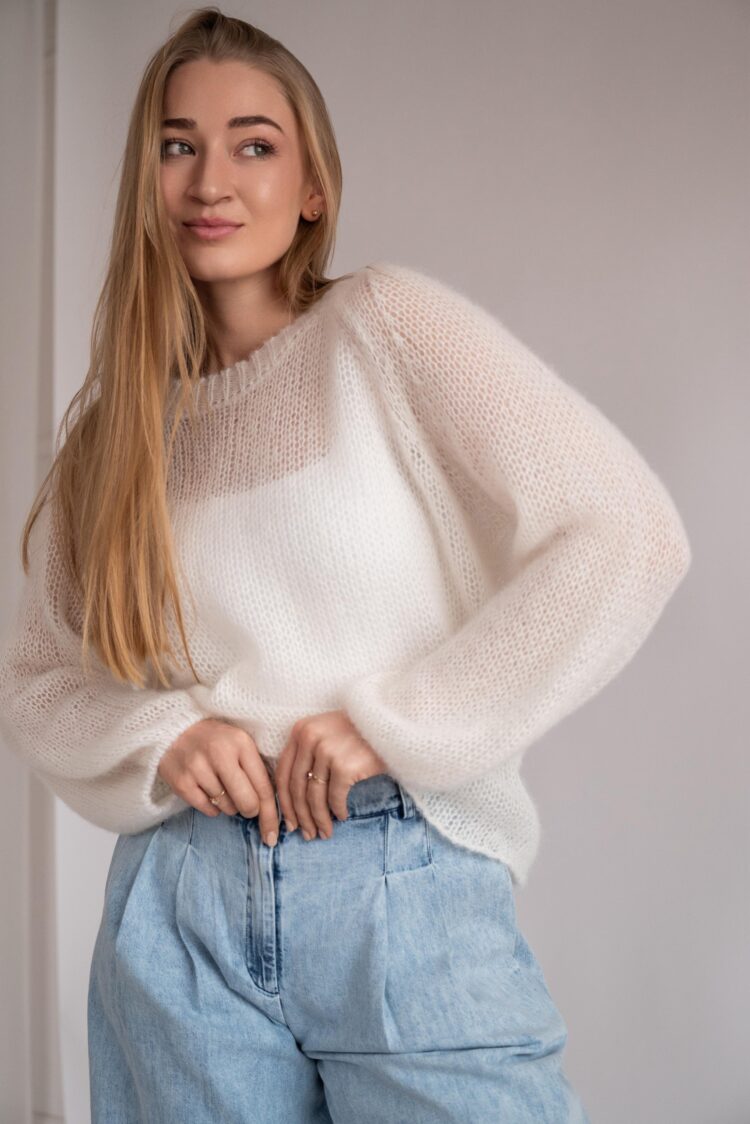 Lekki, ażurowy sweter wykonany z przędzy baby alpaka. Idealny do ulubionych jeansów. Dodaje stylizacji elegancji i ponadczasowości.