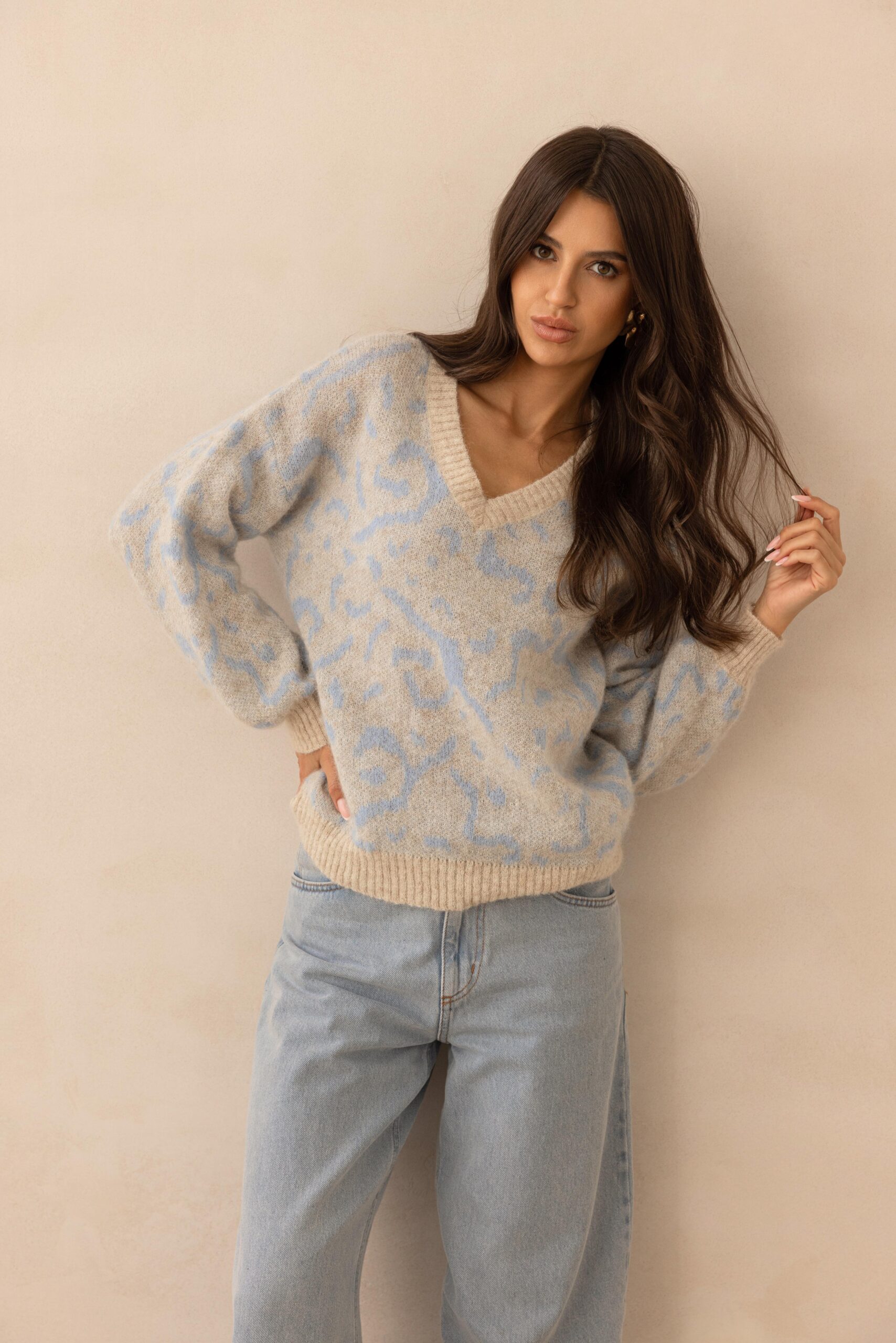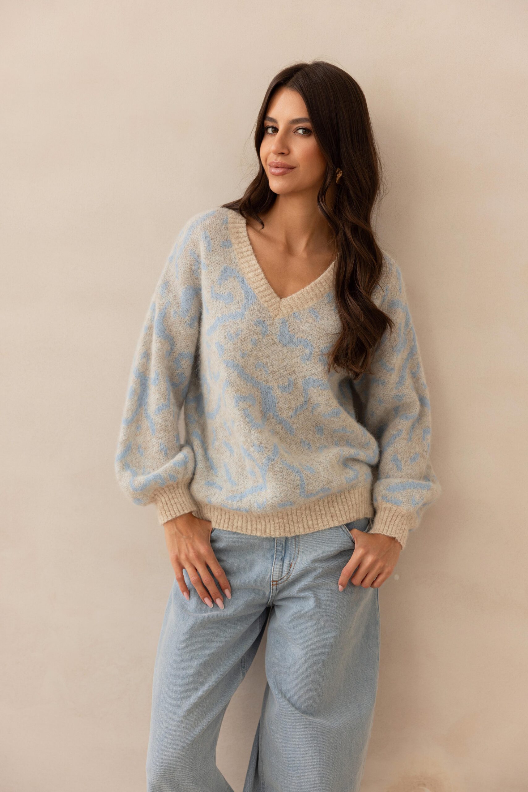 Sweter z baby alpaki w błękitne fantazyjne wzory to wyjątkowy model, który łączy luksusową miękkość naturalnych włókien z artystycznym, przyciągającym wzrok designem. Delikatna baby alpaka sprawia, że sweter jest niezwykle przyjemny w dotyku, lekki, a jednocześnie zapewnia doskonałe ciepło i komfort noszenia. Beżowe, fantazyjne wzory nadają mu niepowtarzalny charakter — subtelnie zdobią całość i dodają stylizacji elegancji z nutą boho. To idealny wybór dla osób, które szukają czegoś wyjątkowego: połączenia klasycznej palety barw z oryginalnym, dopracowanym detalem. Świetnie sprawdzi się w codziennych zestawach, jak i w bardziej wyrafinowanych lookach.